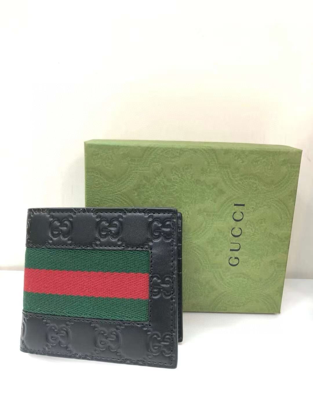 Gucci黑色經典紅綠鏡拼GG壓紋logo短銀包