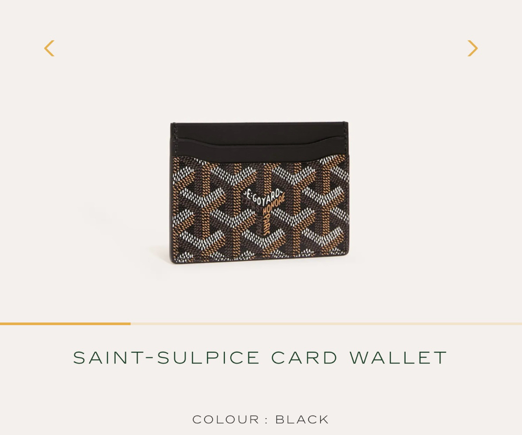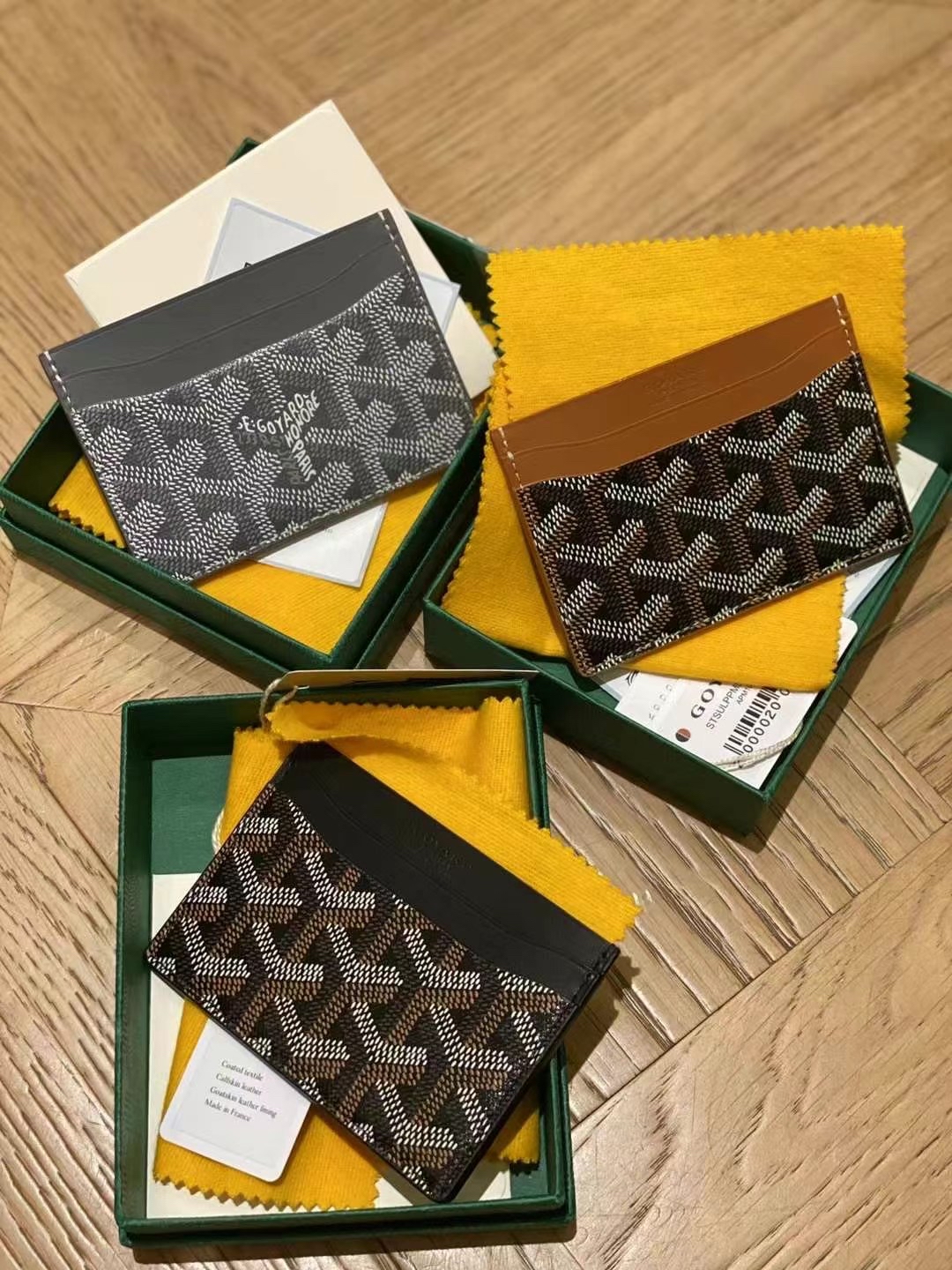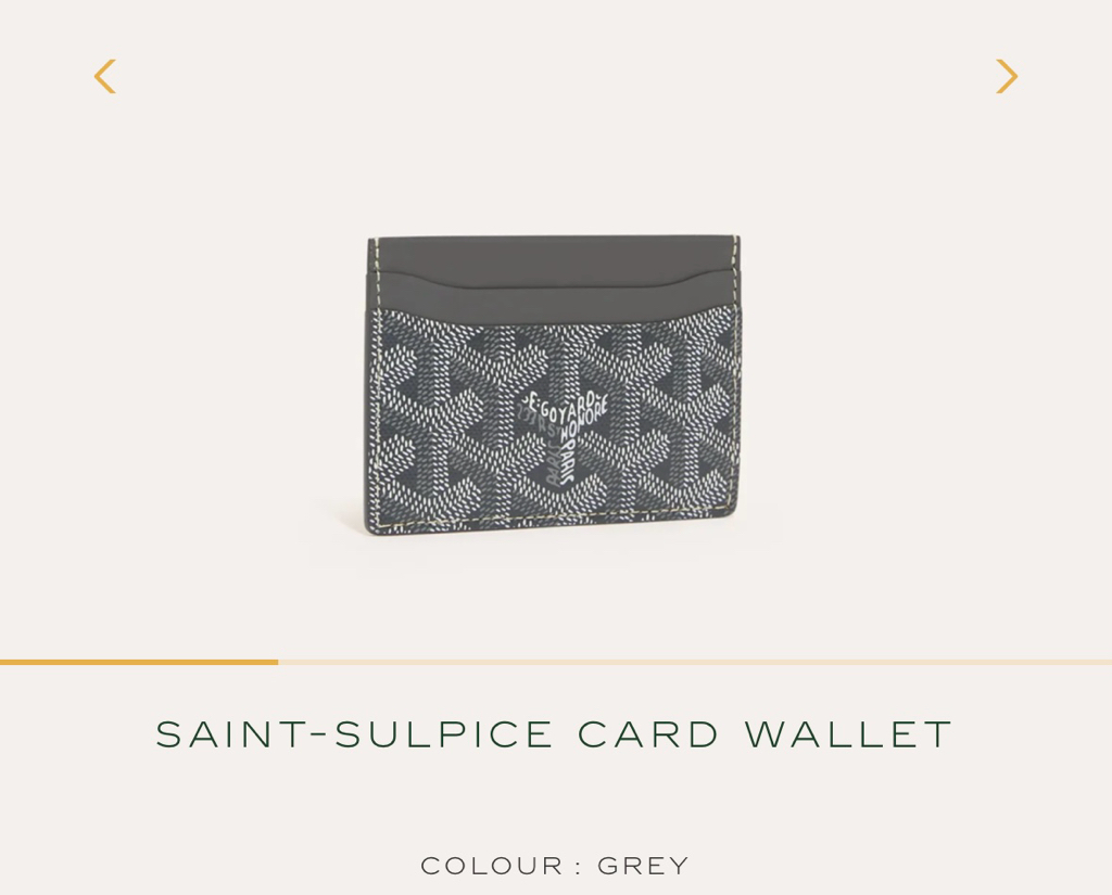 Goyard SAINT-SULPICE 卡片套 經典與實用的完美結合 Goyard SAINT-SULPICE 卡片套是品牌經典與實用主義的代表之作,以其精緻工藝和標誌性的Goyardine帆布聞名。這款卡片套不僅體現了Goyard的奢華品味,更展現了其對細節和功能性的極致追求。 這款卡片套擁有簡潔而實用的設計,旨在安全且便捷地存放您的卡片。它不僅適合商務人士存放名片,也適用於日常存放信用卡、身份證等常用卡片。其纖薄的設計使其能夠輕鬆放入錢包、口袋或手提包中,不佔用額外空間。