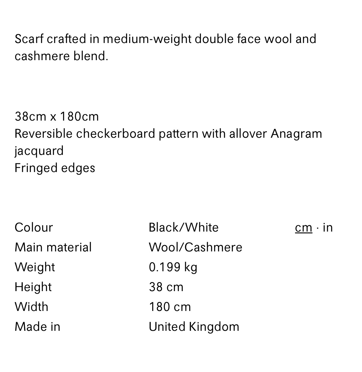 Loewe 羊毛圍巾 * **材質:** 90% 羊毛,10% 喀什米爾,打造極致柔軟舒適的觸感。 * **保暖性佳:** 羊毛與喀什米爾的完美結合,有效抵禦寒冷。 * **輕盈透氣:** 告別厚重悶熱,享受輕盈自在的穿戴體驗。 * **精湛工藝:** 細膩的編織技術,確保圍巾的質感與耐用性。 * **百搭設計:** 簡約大方的風格,輕鬆搭配各種服裝造型。 * **經典單品:** 可以珍藏多年的時尚選擇,永不過時。
