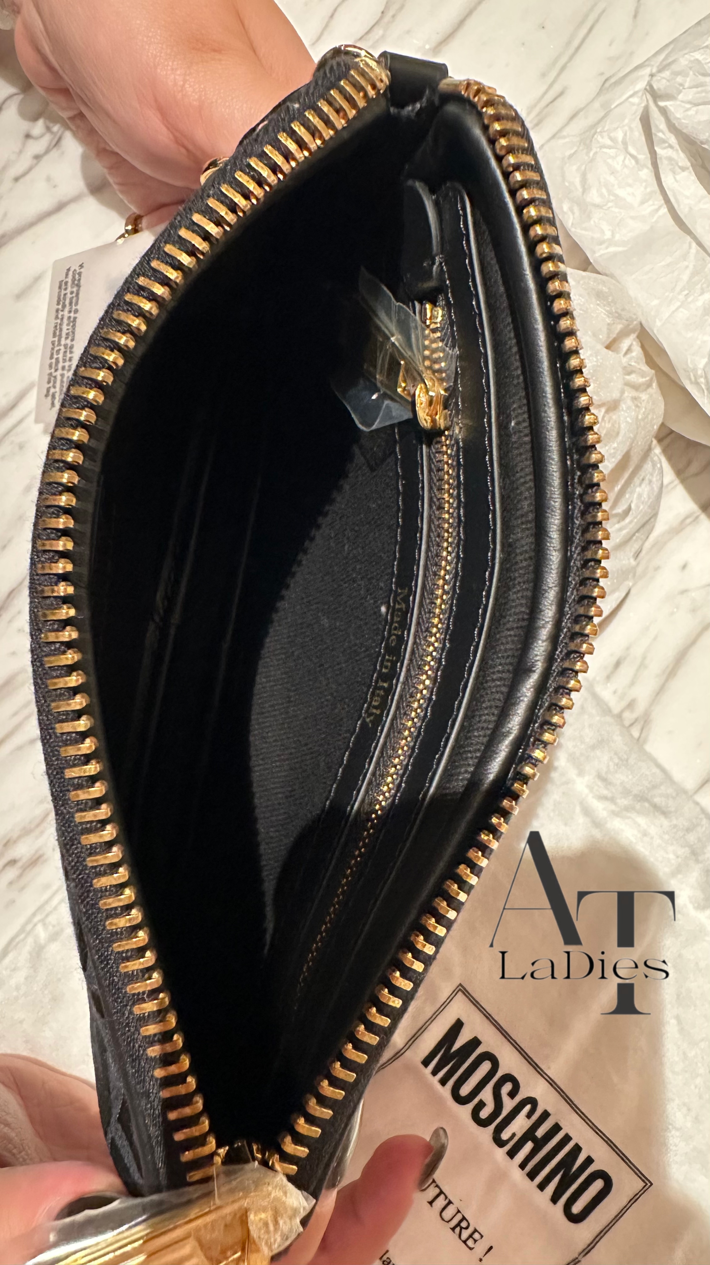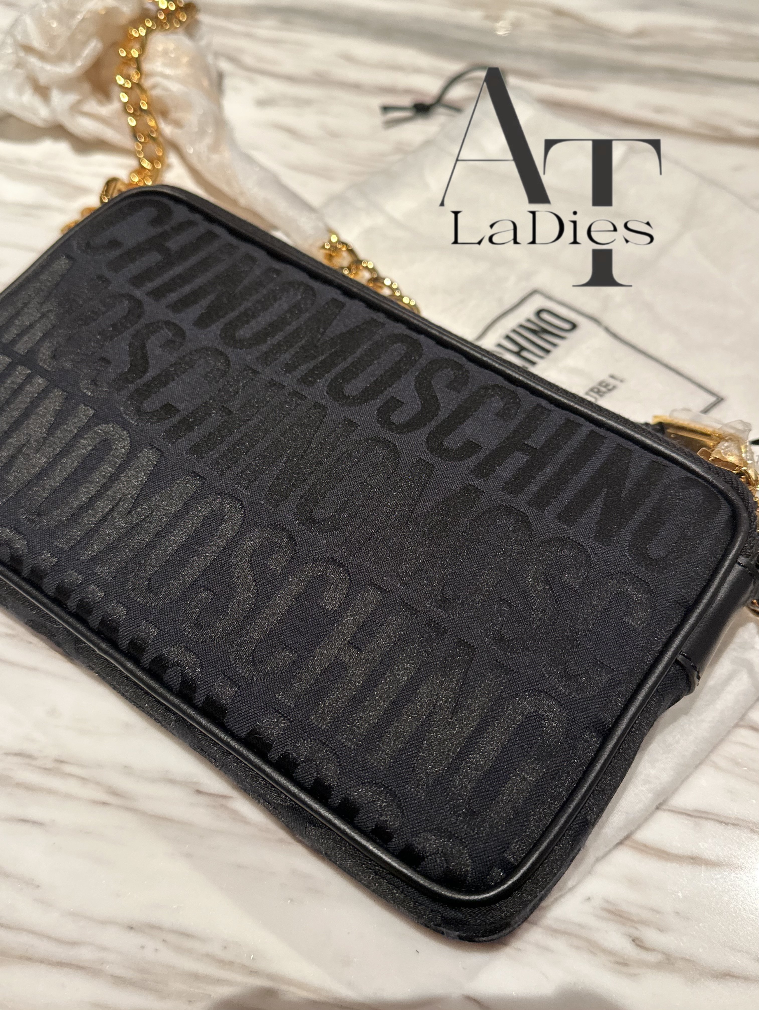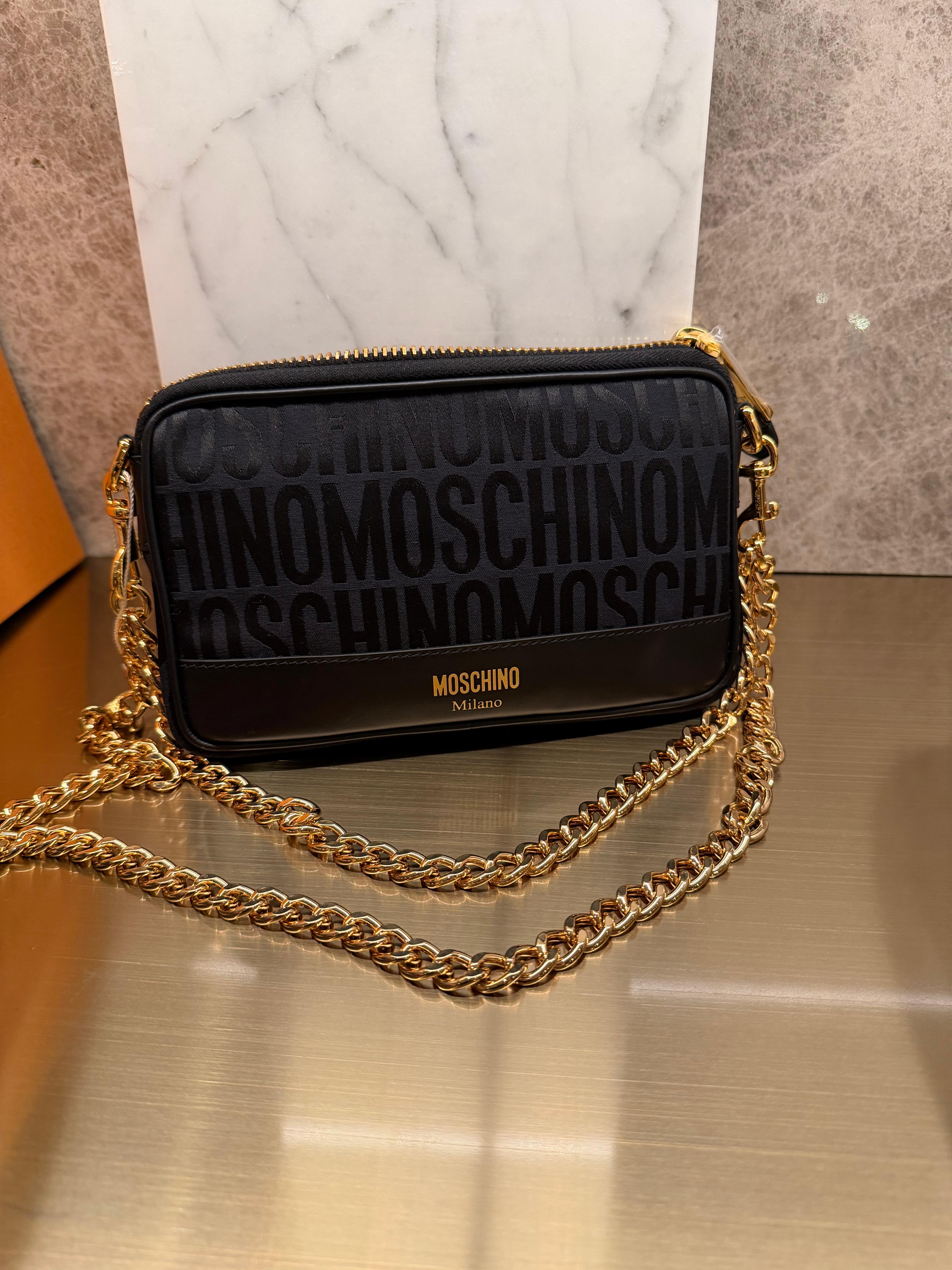 Moschino 黑色滿logo金色鏈條斜孭袋
