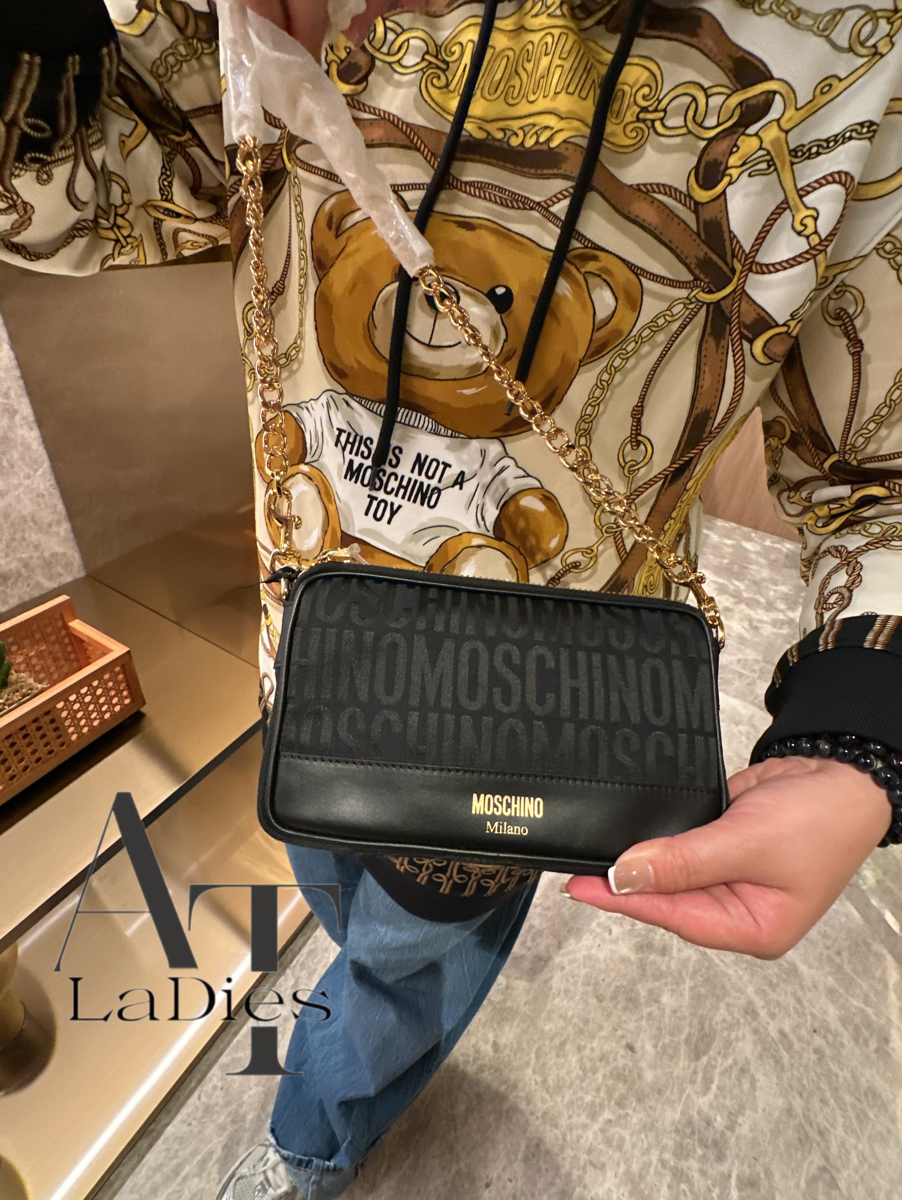 這款手袋設計滿佈 Moschino 經典 logo,低調卻不失辨識度。金色鏈條肩帶不僅增添了幾分奢華感,也讓整體設計更加時髦吸睛。它的大小適中,足以容納你的日常必需品