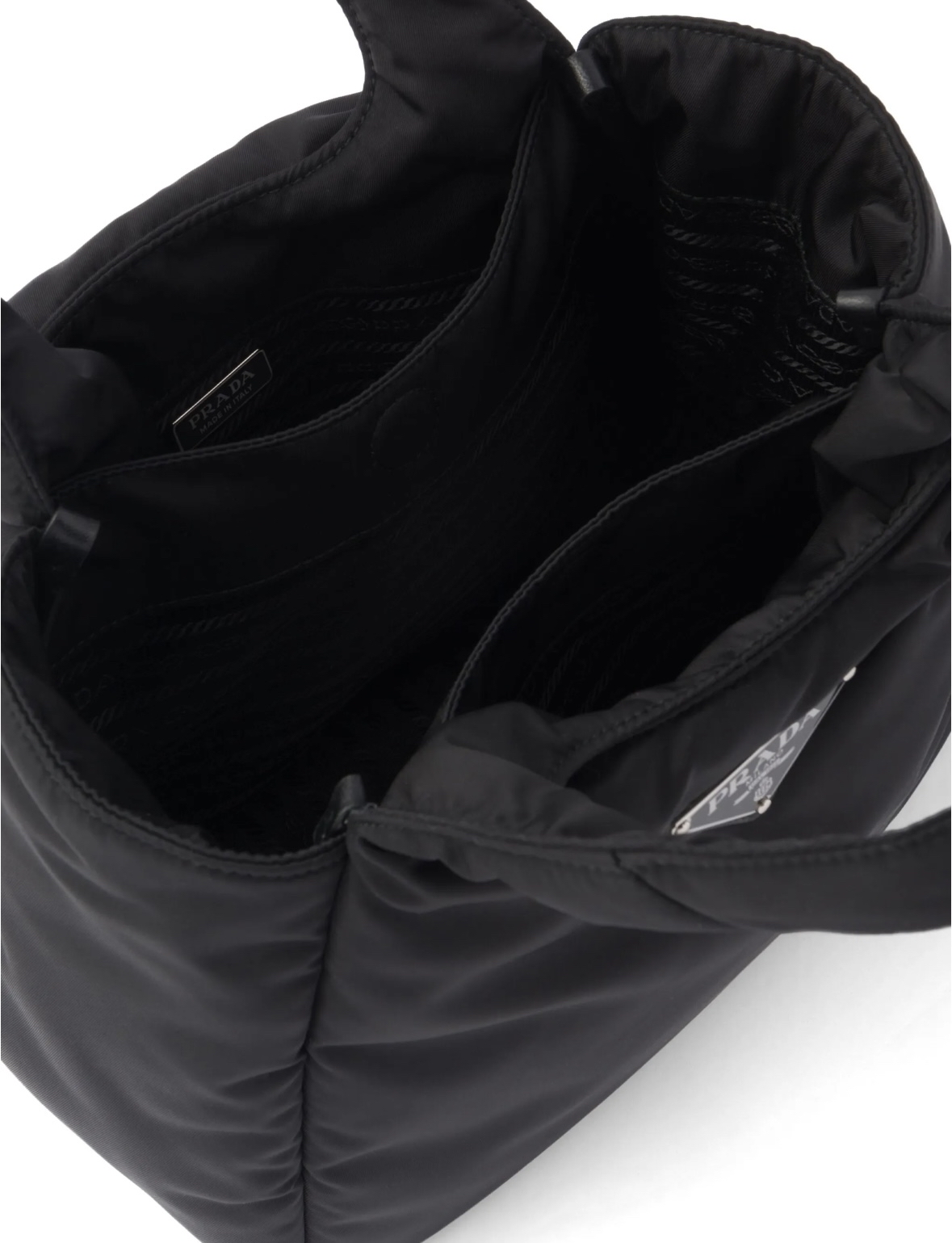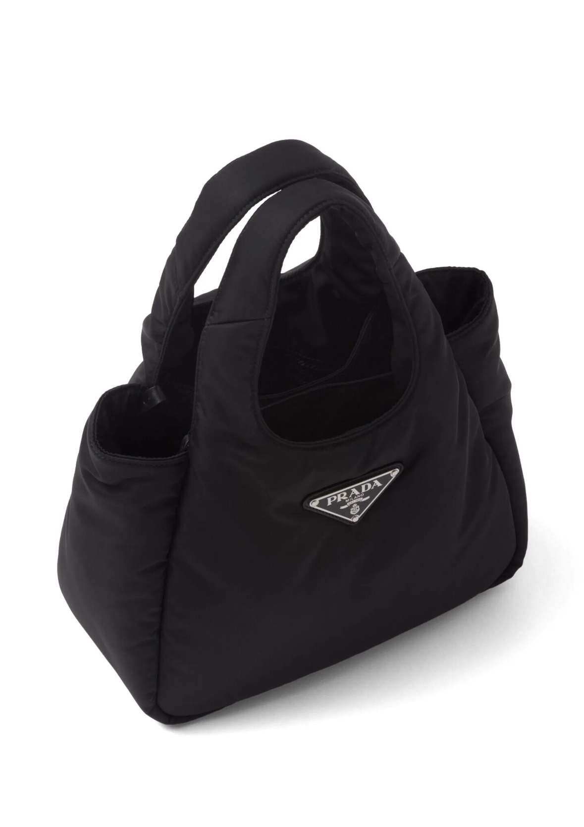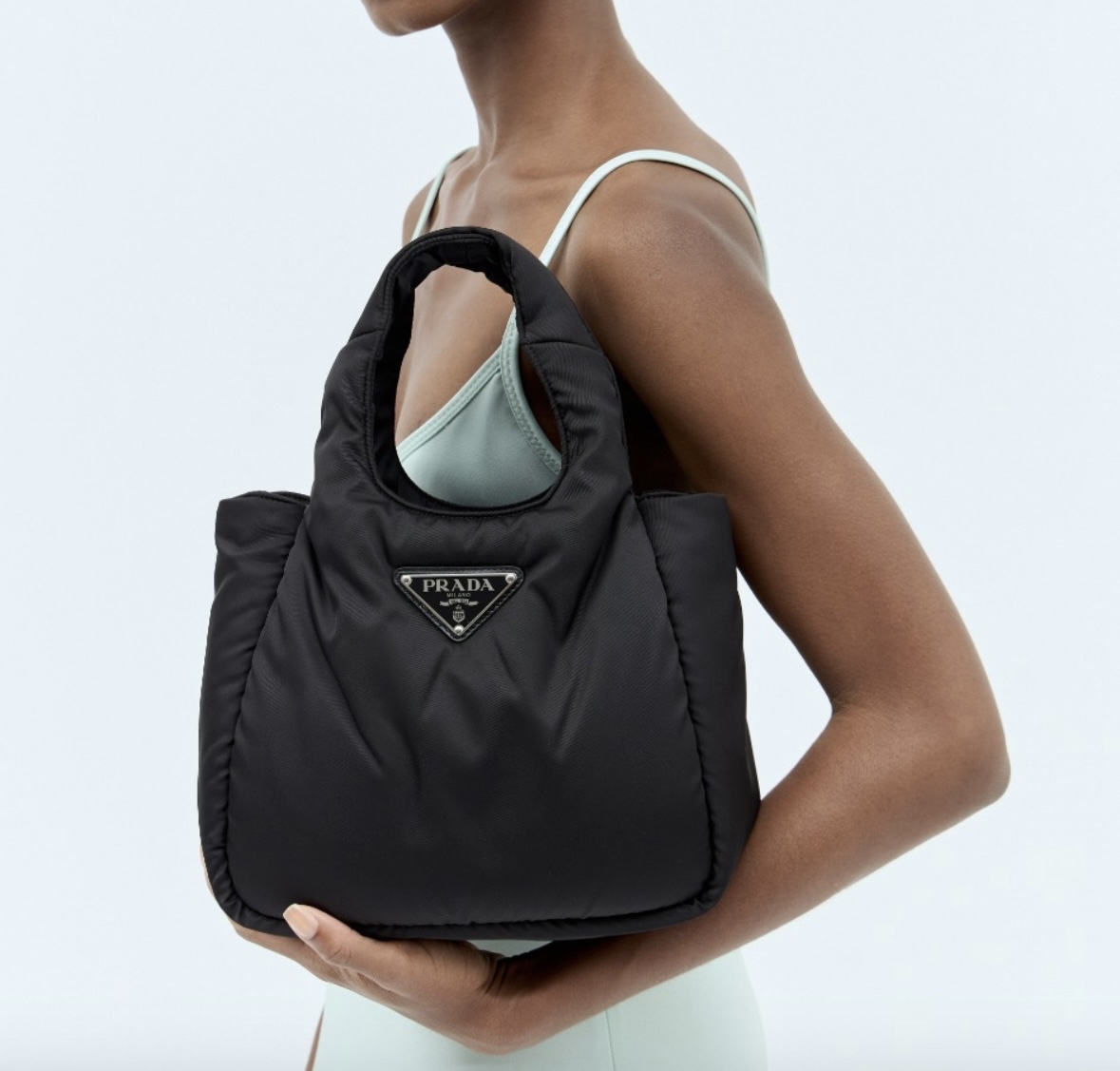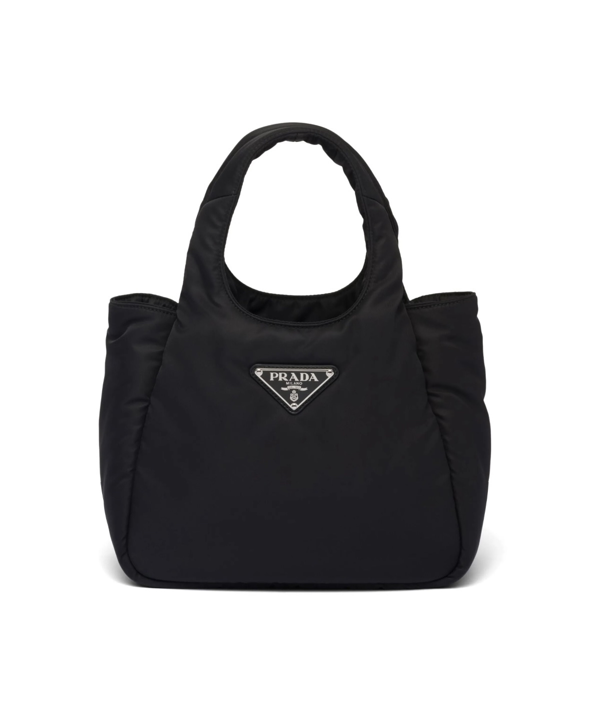 這款手提袋採用Prada標誌性的Re-Nylon材質製成,這種尼龍是由回收的海洋塑料和紡織廢料再生而成,讓你在追求時尚的同時,也能為地球盡一份心力。蓬鬆的夾棉設計不僅帶來視覺上的層次感,也讓手感更加舒適。經典的三角形琺瑯標誌則是Prada的品質保證,低調奢華,盡顯品味。